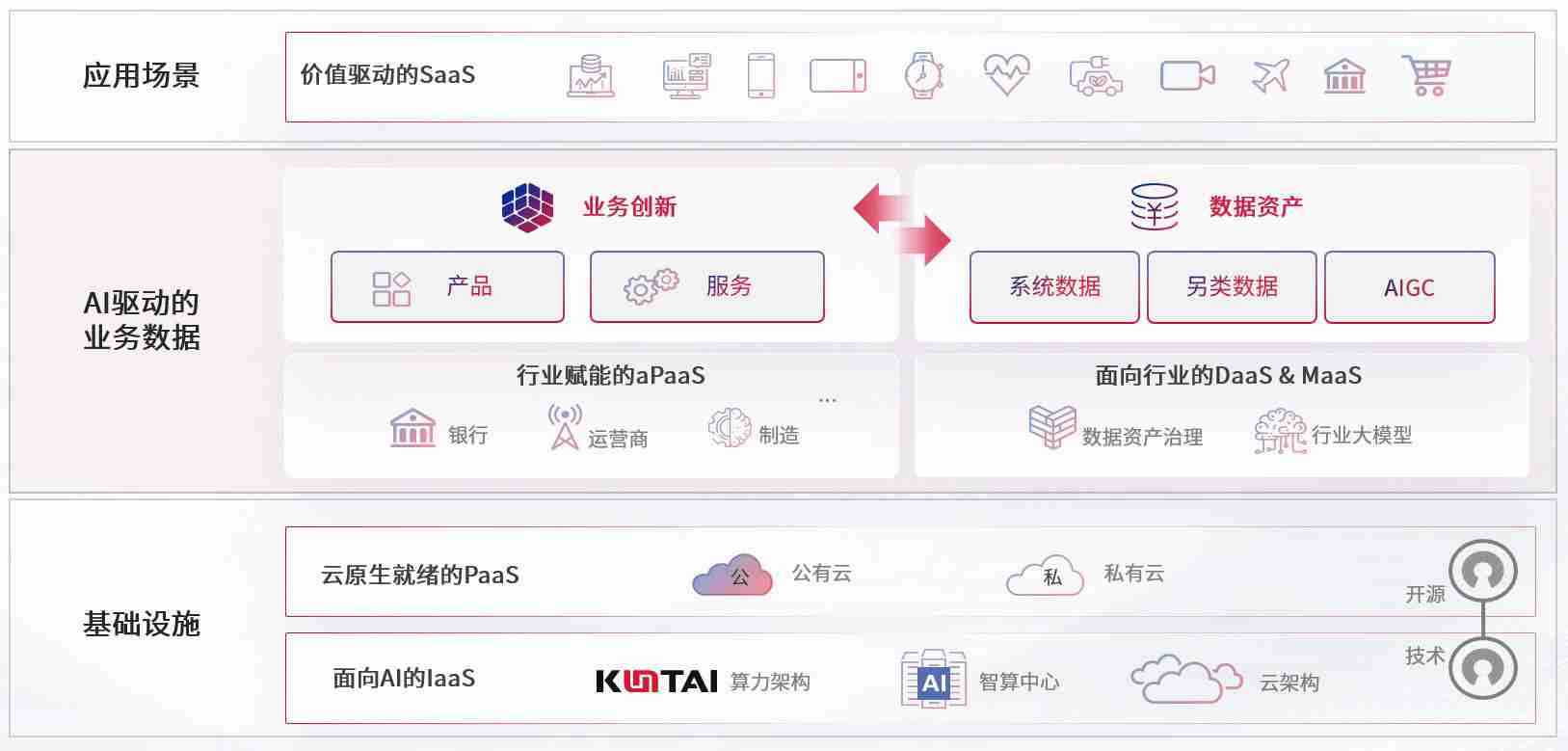数字时代,,,,围绕企业数字化转型的关键要素,,,NG娱乐数码开创性的提出数云融合战略和技术体系框架,,,,着力在云原生、、数字原生、、AI原生和信创产业上架构产品和服务能力,,为处在不同数字化转型阶段的快消零售、、汽车、、、金融、、、医疗、、、政企、、、、教育、、运营商等行业客户提供泛在的敏捷IT能力和融合的数据驱动能力,,构建跨界融合创新的数字业务场景和新业务模式,,,,助力企业级客户建立面向未来的核心能力和竞争优势,,全面推动社会的数字化、、、智能化转型升级。。。