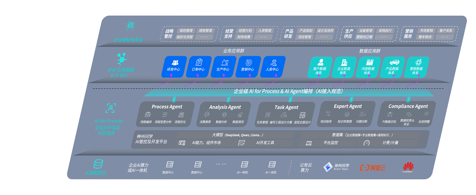 端到端的一站式AI工作空间深度融合了从企业战略规划到日常经营的全流程业务板块,,定向解决车企内部领域多、、、部门多、、链条长、、、、场景碎片化等难题,,支持车企快速构建以AI为核心的生产力写作体系,,,实现任务执行与AI能力的无缝集成与交互