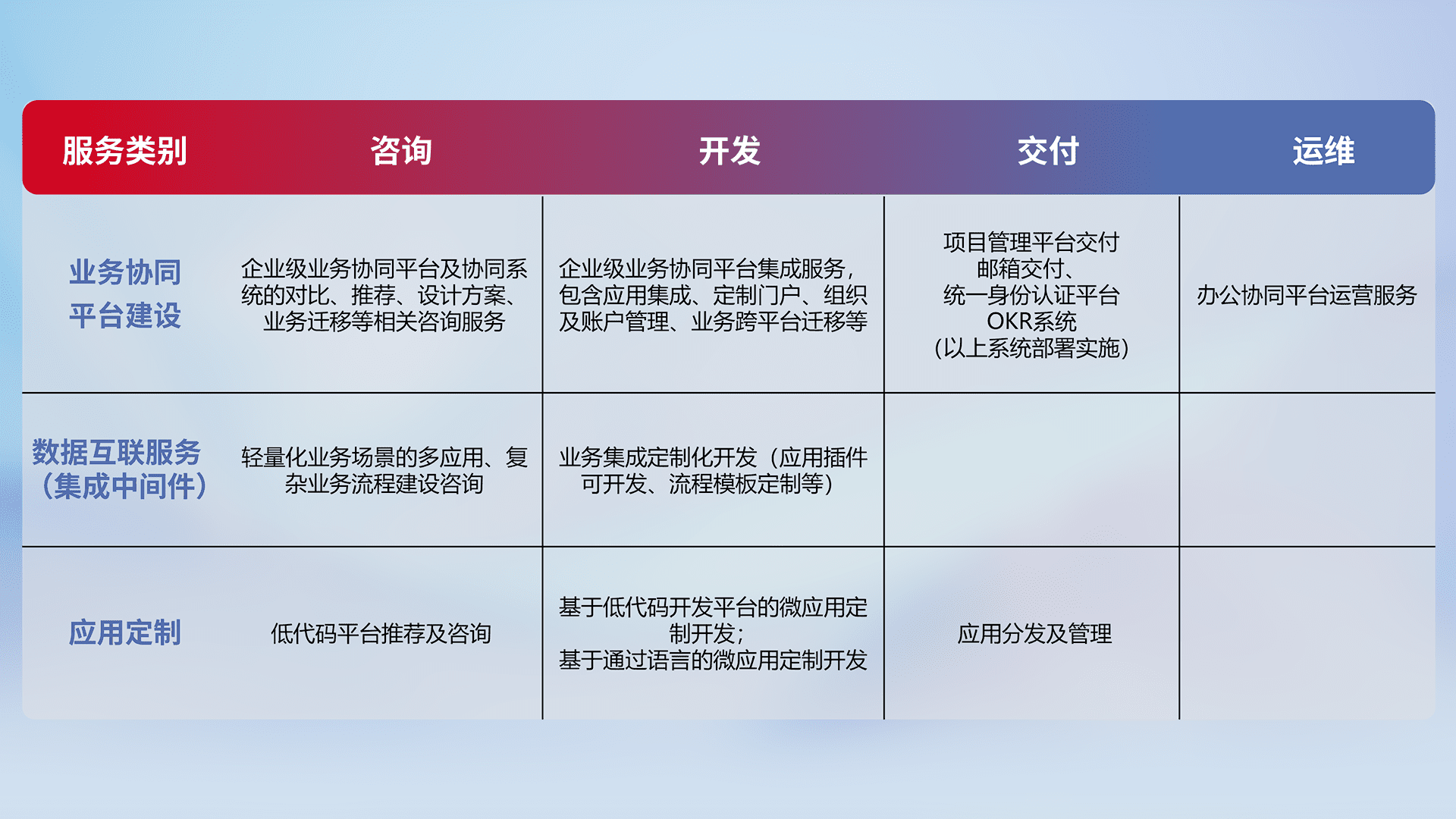 针对钉钉、、企微、、、、IDaas等平台级产品提供产品的规划、、方案、、、、交付、、定制化开发等服务,,,实现如统一协同办公、、、、智能客户服务、、混合会议管理、、、、智能数据查询、、等业务场景,,实现数字化转型。。。